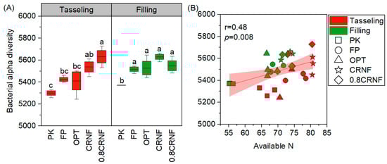 Bacterial alpha diversity under different fertilization treatments (A). Error bars represent the standard deviations of three replicates. Boxes with different letters (shown above each) are significantly different (p < 0.05) according to Fisher’s LSD test. The regression relationships between the soil available N and bacterial alpha diversity (B). PK: no N fertilizer; FP: split application of urea at the farmer’s practice rate; OPT: split application of urea at the optimal fertilizer rate; CRNF: one-time application of controlled-release nitrogen fertilizer; 0.8CRNF: one-time application of CRNF at a 20% reduced rate.