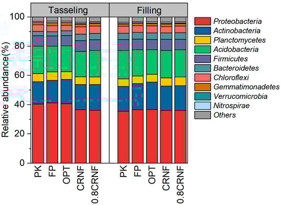 Relative abundance of major bacterial communities at the phylum level under different fertilization treatments. PK: no N fertilizer; FP: split application of urea at the farmer’s practice rate; OPT: split application of urea at the optimal fertilizer rate; CRNF: one-time application of controlled-release nitrogen fertilizer; 0.8CRNF: one-time application of CRNF at a 20% reduced rate.