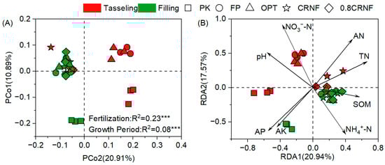 Principal coordinates analysis (A) and redundancy analysis (B) of ASV-based Bray–Curtis distance. *** mark significant differences at p < 0.001 based on PERMANOVA analysis. PK: no N fertilizer; FP: split application of urea at the farmer’s practice rate; OPT: split application of urea at the optimal fertilizer rate; CRNF: one-time application of controlled-release nitrogen fertilizer; 0.8CRNF: one-time application of CRNF at a 20% reduced rate.