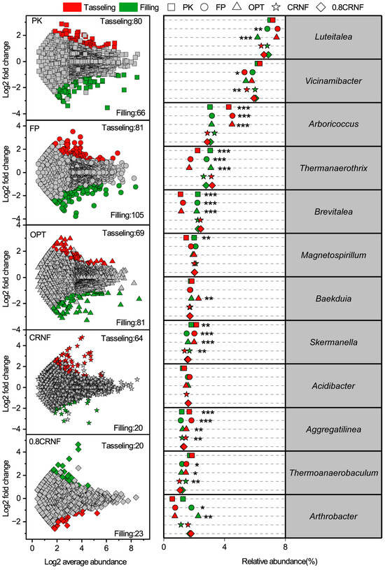 Long-term application of common urea resulted in a larger amount of differentially abundant ASVs than CRNF between the tasseling and filling stages (Figure 4). There were 144, 186, and 150 ASVs that showed significant changes for PK, FP, and OPT treatment, while only 84 and 43 ASVs were strongly affected by the CRNF and 0.8CRNF treatments between the tasseling and filling stages. Specifically, there were 80, 81, 69, 64, and 20 ASVs significantly enriched in the tasseling stage and 66, 105, 81, 20, and 23 ASVs significantly enriched in the filling stage for PK, FP, OPT, CRNF, and 0.8CRNF treatments, respectively. Similarly, among the bacterial genera with the highest relative abundance, there were 6, 9, and 9 genera that showed significant changes for PK, FP, and OPT treatments, while only 4 and 0 ASVs were strongly affected for the CRNF and 0.8CRNF treatments between the tasseling and filling stages. Specifically, for the OPT treatment, the relative abundance of Luteitalea, Arboricoccus, Baekduia, Skermanella, Aggregatilinea, and Thermoanaerobaculum was higher in the tasseling stage, while the relative abundance of Thermanaerothrix, Brevitalea, and Arthrobacter was higher in the filling stage. For the CRNF treatment, the relative abundance of Aggregatilinea was higher in the tasseling stage, while the relative abundance of Vicinamibacter, Skermanella, and Thermoanaerobaculum was higher in the filling stage.