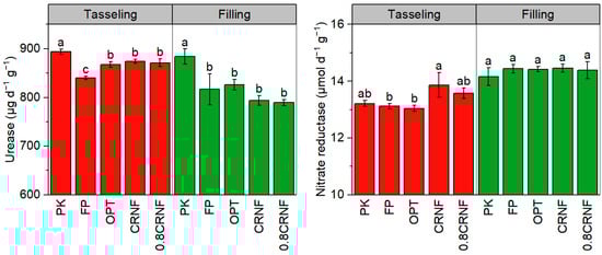 Compared with the treatments with N fertilizer, PK treatment exhibited the highest urease activity (Figure 5), which was 2.27–6.26% higher at the tasseling stage, and 7.02–11.42% higher at the filling stage, respectively. The nitrate reductase activity varied among the different treatments and growth stages. At the tasseling stage, the nitrate reductase activity in the CRNF treatment exhibited a significant increase of 6.36% compared to the OPT treatment. In addition, nitrate reductase in the PK, FP, and NPK treatments increased significantly by 7.19%, 10.06%, and 10.59%, respectively, in the filling stage compared with the tasseling stage, but the changes were not significant in the CRNF treatment.
