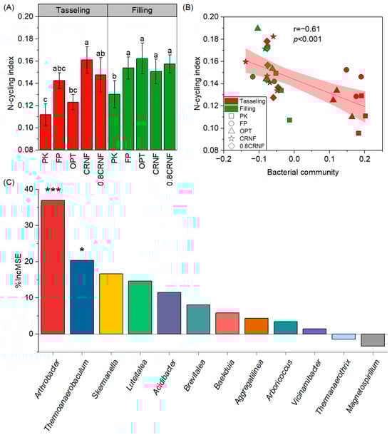 Different N fertilizer application regimes significantly affected the soil N-cycling index (Figure 7). During the tasseling stage, the CRNF treatment showed the highest N-cycling index, increasing significantly by 44.02% compared to the PK treatment and by 30.88% compared to the OPT treatment. During the filling stage, there were no significant differences in the N-cycling index among the N fertilizer application treatments (FP, OPT, CRNF, and 0.8CRNF), but it increased significantly by 18.21%, 24.75%, 15.73%, and 20.89%, respectively, compared to the PK treatment. The results of the linear regression analysis showed that there is a significant correlation between the N-cycling index and the soil bacterial community structure under different fertilization treatments (r = −0.61 p < 0.001). The random forest model analysis found that Arthrobacter and Thermoanaerobaculum are closely related to the soil N-cycling index.