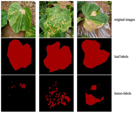 This study mainly focused on the task of cucumber disease segmentation in complex environments. The image data were acquired from a self-collected dataset of the Xiaotangshan National Precision Agriculture Research Demonstration Base. Cucumber leaf images were captured via a mobile phone (Huawei P20). Considering the diversity of lighting conditions in practical applications, data were collected at three different time periods every day during the planting season: morning (8:00–10:00), noon (12:00–14:00), and afternoon (15:00–17:00). As shown in Figure 1 and Table 1, the collected images included five categories, namely healthy cucumber leaves, cucumber downy mildew, cucumber anthracnose, cucumber powdery mildew, and cucumber virus disease. The dataset used to train leaf segmentation consists of 1140 images. It is randomly divided into a training set and a test set in a ratio of 8:2, with 912 images used for training and 227 images used for testing. It should be noted that after a leaf is infected with powdery mildew or viral disease, the boundary between the diseased area of the leaf and the healthy area of the leaf is blurred, which makes it extremely difficult to label the boundary of the diseased spot. Therefore, in the training stage of the lesion segmentation model, the dataset we used consists of 405 images, and the disease types include only downy mildew and anthracnose. Cucumber leaf images were cropped from the original size of 2976 × 2976 pixels to 512 × 512 pixels. The Labelme-5.0.0 software was used to label the leaves and disease spots at pixel level and to generate mask images, as shown in Figure 2.