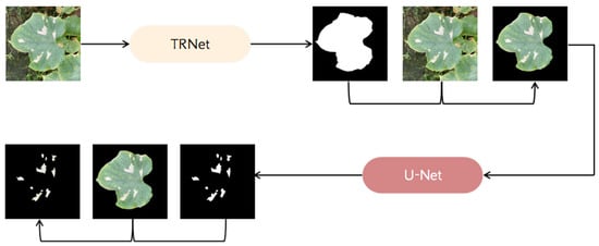 Due to interference from complex backgrounds and significant differences in the scale of disease spots, it is difficult to achieve the accurate segmentation of cucumber leaves and disease spots using a one-stage segmentation model. Therefore, a two-stage model was designed in this study to decompose a complex task into two simple subtasks. The proposed two-stage model, namely TUNet, consisted of TRNet and U-Net. In the first stage, TRNet was used to segment the target leaf from complex backgrounds. In the second stage, U-Net was used to further segment disease spots from the obtained target leaf. The advantage of two-stage segmentation is that the model only needs to focus on one type of target at each stage (leaf target in the first stage and disease spot target in the second stage). For the two different targets, semantic segmentation models with different structures were selected according to the specific needs of each target, so as to combine the advantages of the two models to improve the segmentation accuracy. The framework of the proposed two-stage model is shown in Figure 3. The structure and key algorithms of the two models used will be described in detail in the following sections.