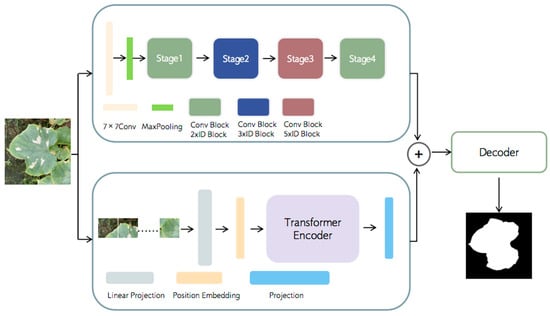 Therefore, we chose the TRNet model, which combines a Transformer and convolutional structures, to extract features in parallel. This method not only improved the extraction of global features, but also maintained an excellent grasp of low-level details. Thus, it could effectively reduce the interference caused by the overlap of leaves and improve the accuracy of leaf segmentation. The encoder part of TRNet was composed of ResNet50 and a Transformer, as shown in Figure 4.