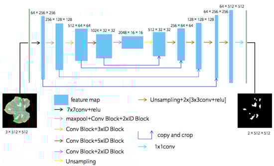 In the second stage, considering the multi-scale nature of the disease spots and a relatively small sample size of the dataset, we chose the U-Net structure, which uses ResNet50 as the backbone, to segment disease spots (see Figure 7 for the network structure). U-Net is a model based on an encoder-decoder structure, consisting of two parts, where ResNet50 serves as the encoder (details in Section 2.3.1). The structure of U-Net is symmetric. After down-sampling an image 32 times, up-sampling is conducted. After each round of up-sampling, the sample is fused at the same scale as the number of channels corresponding to the feature extraction part. Since the feature map at the top level of the network has a smaller down-sampling factor, more details can be retained, resulting in a more detailed feature map. On the contrary, the feature map at the bottom of the network loses a lot of information during the down-sampling process due to a larger down-sampling factor, resulting in a significant spatial loss. However, this also results in a high concentration of information, which is conducive to the determination of the target region in order to effectively retain the detailed information in the image.
