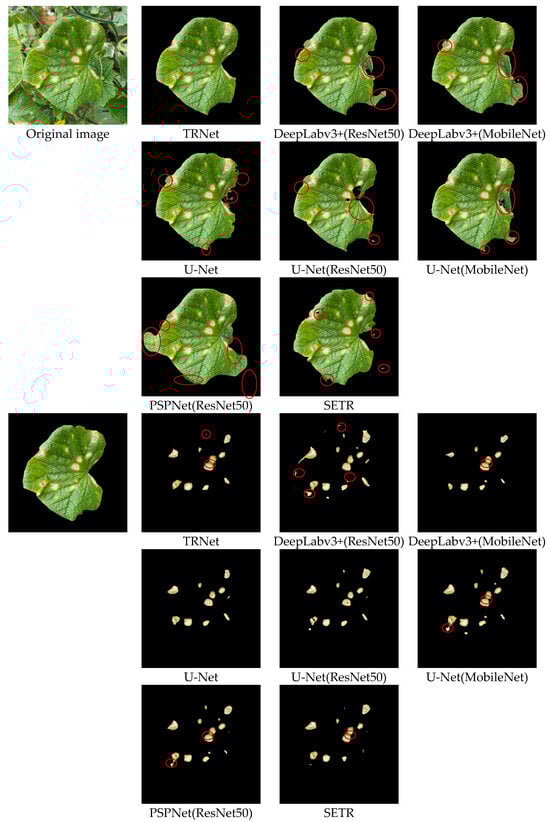 Disease images collected in a production environment have problems with overlapping leaves and complex backgrounds, which makes it difficult to separate leaves from the background. In order for the model to accurately segment the target blade, the model must take into account the global features while paying attention to the local features. TRNet combines the advantages of the Transformer and the convolutional neural network. The Transformer’s ability to control the global features allows the model to better focus on the entire image, improves the attention weight of the target leaves, and reduces segmentation errors caused by complex backgrounds. At the same time, the focus on local features makes TRNet equally sensitive to detailed features in the target leaves. Therefore, the TRNet network achieves the best segmentation performance of leaves and lesions, with a PA of 93.94%, an IoU of 96.86%, a Dice coefficient of 72.25%, and a Recall of 98.60%. Compared with the SETR model using the Transformer as the encoder, the PA was improved by 2.38%, the IoU was improved by 4.25%, the Dice coefficient was improved by 1.13%, and the Recall was improved by 2.46%. Among the segmentation networks using convolutional networks as encoders, DeepLabV3+(ResNet50) achieved the highest metrics, which were 92.90%, 95.49%, 71.65%, and 97.42% for the PA, IoU, Dice coefficient, and Recall, respectively. The PA, IoU, Dice coefficient, and Recall for TRNet increased by 1.04%, 1.37%, 0.6% and 1.18%, respectively, compared to DeepLabV3+(ResNet50). It can be seen that the segmentation performance of TRNet was significantly improved. It further shows that the combination of the Transformer and the CNN was effective.