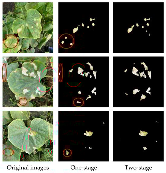 The segmentation results are shown in Figure 10. It can be seen that the results obtained from two-stage segmentation were far better than those obtained from one-stage segmentation. In the three images shown in Figure 10, some disease spots on non-target leaves were mistakenly segmented using one-stage segmentation. This is because one-stage segmentation does not remove confounding factors, such as overlapping leaves before disease spot segmentation, leading to poor segmentation results. Therefore, in this study, a two-stage model was proposed for disease severity grading in order to guarantee a high classification accuracy.