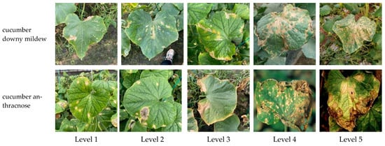 At present, there is no unified standard for the severity grading of cucumber downy mildew. According to the relevant literature, commonly used methods for the severity grading of cucumber downy mildew are mainly based on (1) the ratio of the total area of disease spots to the area of the entire leaf and (2) the number of disease spots per unit leaf area. In this study, the first method was adopted. The disease severity was divided into five levels, as detailed in Section 3.4. Figure 11 shows the images of cucumber downy mildew and cucumber anthracnose from severity Level 1 to Level 5.