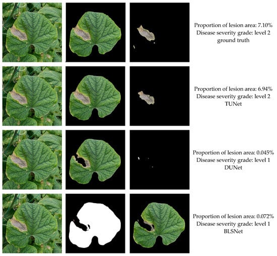A comparison of the results of the proposed model TUNet and the existing models is shown in Table 10. Ref. [34] uses the two-stage method DUNet to segment diseased leaves and lesions, and Ref. [13] uses an improved U-Net model to simultaneously segment leaves and lesions. As can be seen in Table 10, TUNet has a higher accuracy in disease severity grading compared to Ref. [34]. The one-stage model in Ref. [13] has a speed advantage, but the accuracy is much lower than the two-stage model.