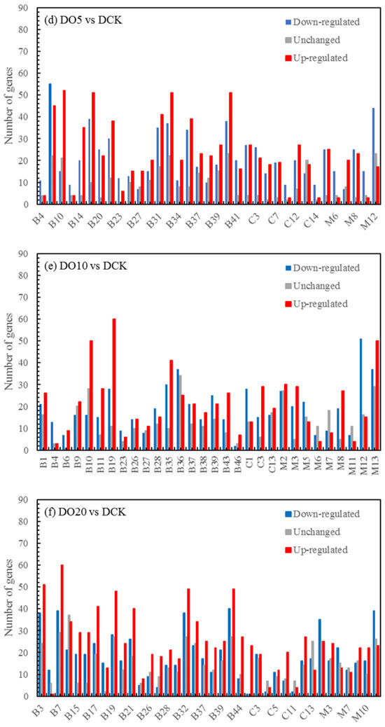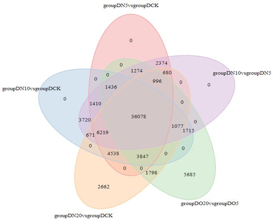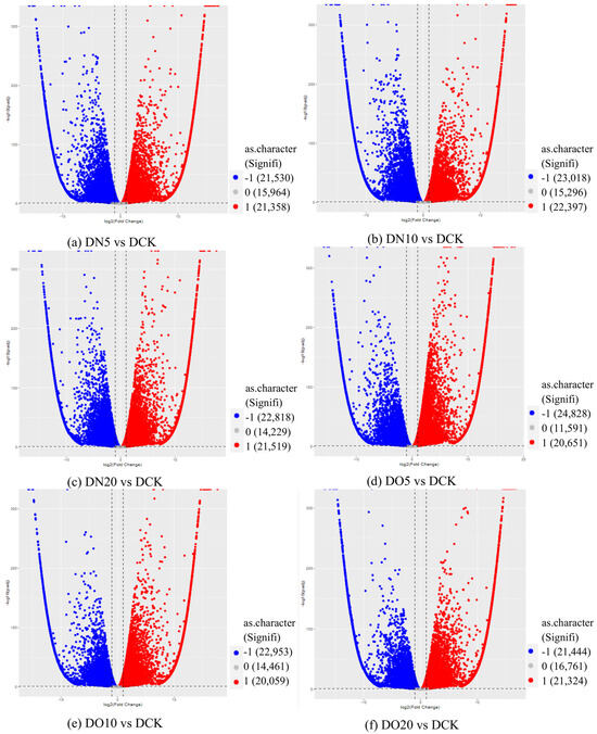 The differential expression analysis focuses on identifying genes that are differentially expressed (DEGs) between samples and subsequently functionally analyzing these genes. Based on the criteria of |log2(fold change)| ≥ 1 and FDR < 0.05 for significant DEGs, our results revealed a total of 58,852, 60,711, and 58,566 significantly differentially expressed genes between DN5, DN10, and DN20 compared to DCK, respectively (Figure 2a–c). Additionally, we observed a significant differential expression in 57,070, 57,473, and 59,529 genes between DO5, DO10, and DO20 compared to DCK, respectively (Figure 2d–f).