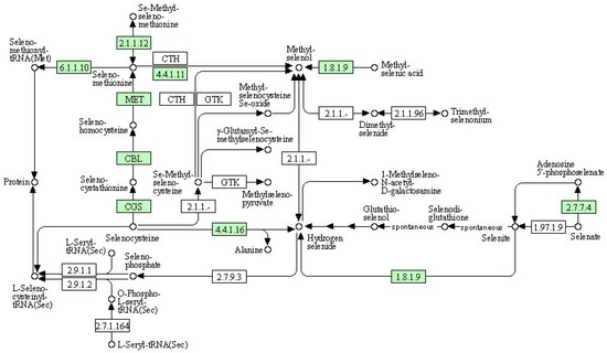 We used a bioinformatics analysis to explore the leaf genome and determine the comprehensive metabolic pathway of selenium compounds (Figure 8). The metabolism of selenocompounds begins with the conversion of selenocysteine through cystathionine gamma-synthase (CGS), resulting in the release of seleno-cystathionine. The subsequent compound undergoes a metabolic transformation via cysteine-S-conjugate beta-lyase (CBL), leading to the liberation of selenohomocysteine. This resulting compound reacts with 5-methyltetrahydrofolate-homocysteine methyltransferase (MET), resulting in the liberation of seleno-methionine. Seleno-methionine can be further metabolized into either seleno-methionyl-tRNA or methyl-selenol. Alternatively, methyl-selenol can also be formed from the reaction between methyl-selenic acid and thioredoxin reductase or Se-methyl-seleniumcysteine through cystathionin gamma-lyase (CTH). Compared to the control group, there were significant differences in gene expression between the nanoselenium treatment and the organic selenium treatment, as shown in Table 12.