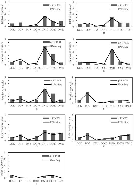 qRT-PCR identification and RNA-seq analysis. Note: (A): LOC103837231, adenylate kinase 2; (B): LOC103858064, glutathione peroxidase 3; (C): LOC103842805, glutathione S-transferase U25; (D): LOC103830524, glutathione S-transferase U20; (E): LOC103844552, thiamine pyrophosphokinase 1; (F): LOC103872309, ABC transporter G family member 35; (G): LOC103867761, ABC transporter G family member 1; (H): LOC103844798, ATP-dependent zinc metalloprotease FTSH 11; (I): LOC103866104, cysteine synthase.