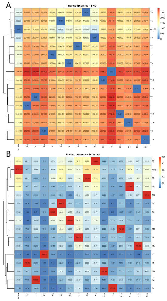 In the transcriptomic case, the results of the comparison based on the SHD and the percentage of the directed edges in each of the reference causal structures that remained directed with the same direction in each of the remaining causal structures are displayed in Figure 1. It is shown in Figure 1A that in the case that the 11th tissue (“Dormancy buds”) was removed from the transcriptomic database, the impact was the highest of all cases, since the CPDAG T11 exhibited the highest SHD compared to ALL15T (2256) among all CPDAGs, and, in addition, T11 exhibited the highest SHD to each of the reference CPDAGs, compared to all other CPDAGs. The smallest SHD compared to ALL15T was observed in the case of CPDAG T5 (882). Other than that, it was observed that CPDAGs corresponding to the removal of tissues with similar biological functions, such as tissues 3–6 (“Fruit 1st stage”, “Fruit 2nd stage”, “Fruit 3rd stage”, and “Fruit 4th stage”) were not clustered together in the heatmap. Similarly, the CPDAGs T7–T10 (“Stem 1st stage”, “Stem 2nd stage”, “ Stem 3rd stage”, and “ Stem 4th stage”), the CPDAGs T1–T13 (“Dormancy buds”, “Flower”, “Flower buds”), and T14–T15 (“Leaves”, “Young leaves”) were not clustered together as well (Figure 1A).