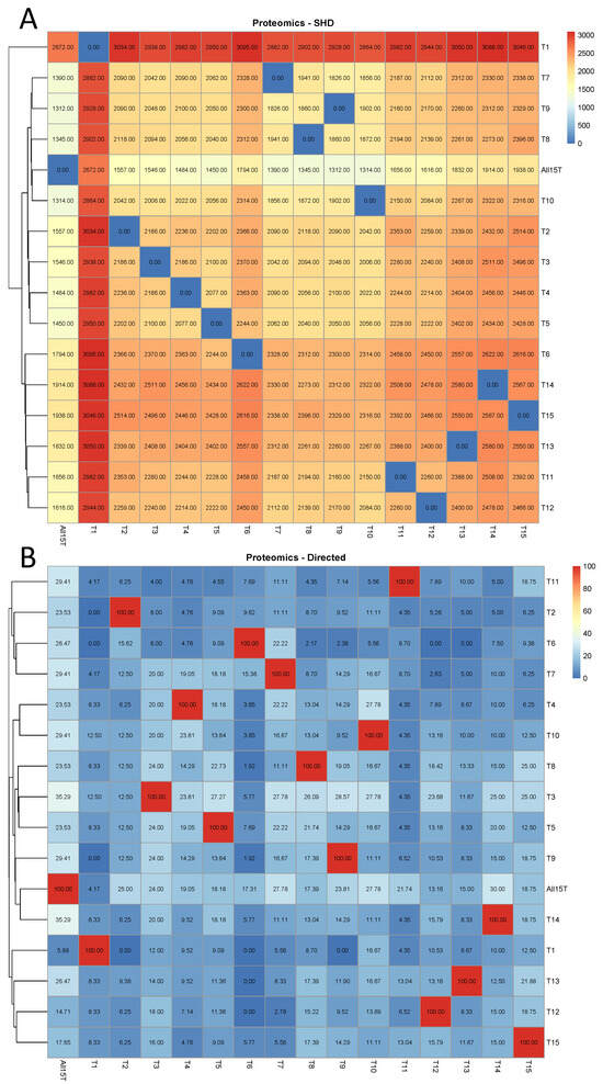 Proteomic analysis. The comparison of each of the 16 CPDAGs (rows) to all 16 reference CPDAGs (columns) is displayed. Hierarchical clustering was performed by row. (A) SHDs, (B) The percentages of the directed edges in each of the reference causal structures that remained directed with the same direction in each of the 16 CPDAGs.