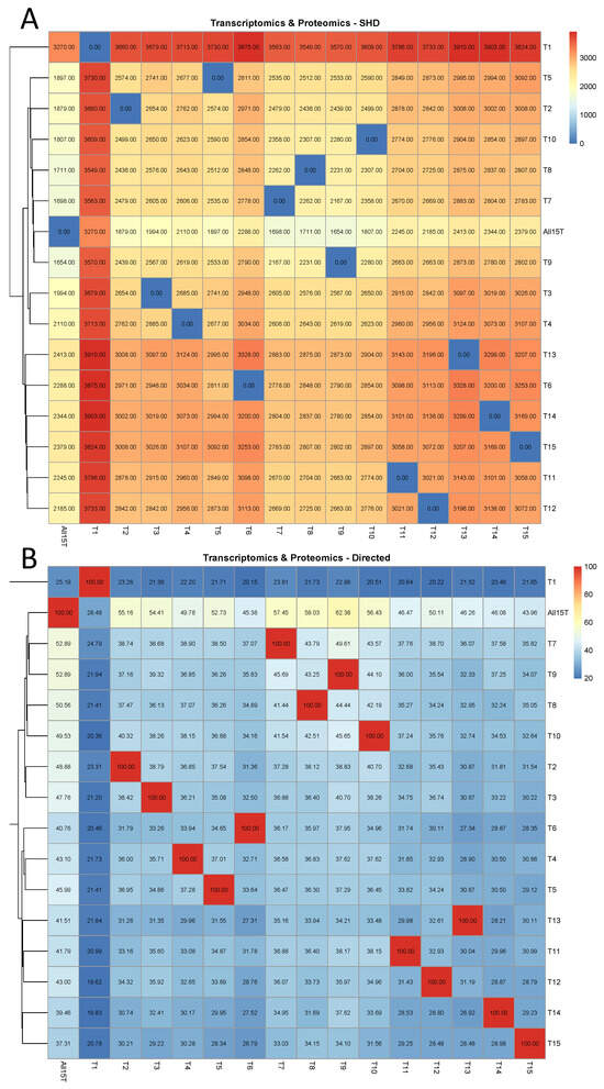 In the proteogenomic case, it is shown in Figure 3A that when the 1st tissue (“1st Bloom”) was removed from the combined database, the impact was the highest of all cases and CPDAG T1 exhibited by far the highest SHD among all CPDAGs, compared to ALL15T (3270). T1 exhibited the highest SHD to each of the CPDAGs when treated as a reference, compared to all other CPDAGs as well. The smallest SHD compared to the CPDAG ALL15T was observed in the case of CPDAG T9 (1654). These results are similar to the respective results in the proteomic analysis. Moreover, the CPDAGs corresponding to the exclusion of tissues 3–4, which are related to the fruiting stage, were clustered together in the heatmap (Figure 3A). Similarly, the CPDAGs T7–T10 that correspond to the four stem stages were also clustered close to each other. In addition, CPDAGs T11–T12 (corresponding to the tissues “Dormancy buds” and “Flower”), and T14–T15 (“Leaves”, “Young leaves”) were clustered together, respectively, as well (Figure 3A).