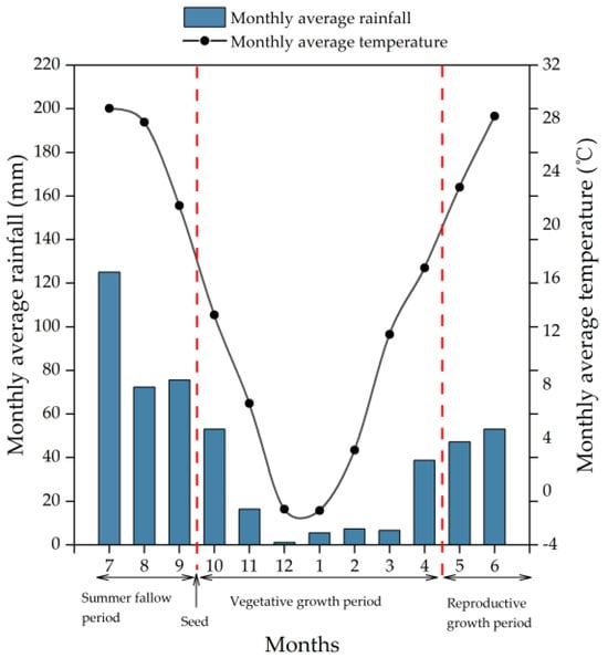 Each treatment included three replicates organized into randomized blocks. The seeding techniques involved utilizing machinery covering the ridges with mulch and sowing the furrows between the mulch. All fertilizers were uniformly applied to the corresponding plots once per growing season before sowing. Sowing occurred annually in late September at a rate of 150 kg·hm−2. Crops were harvested in early June of the following year, and the idle summer period spanned from mid-June to mid-September. Throughout the experimental period, irrigation was omitted, relying solely on natural precipitation.
