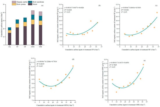 (a) Ten-year cumulative carbon inputs per treatment. (b) Relationship between treatment FP year-to-year carbon inputs and soil organic carbon. (c) Relationship between treatment OF year-to-year carbon inputs and soil organic carbon. (d) Relationship between treatment OFM year-to-year carbon inputs and soil organic carbon. (e) Relationship between treatment OFB year-to-year carbon inputs and soil organic carbon.