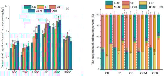 (a) Content of soil carbon fractions under different fertilization treatments. (b) Proportion of soil carbon fractions under different fertilization treatments. Error bars represent the standard deviations from the mean (n = 3), and different lowercase letters indicate significant differences between different treatments (p < 0.05).