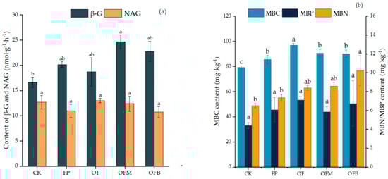 (a) Content of β-1,4-glucosidase (β-G) and β-1,4-N-acetylaminoglucosidase (NAG) under different fertilization treatments. (b) Content of microbial biomass carbon (MBC), microbial biomass phosphorus (MBP), and microbial biomass nitrogen (MBN) under different fertilization treatments. Error bars represent the standard deviations from the mean (n = 3), and different lowercase letters indicate significant differences between different treatments (p < 0.05).