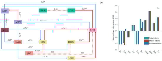 (a) Soil pH, β-1,4-glucosidase (β-G), β-1,4-N-acetylaminoglucosidase (NAG), microbial biomass nitrogen (MBN), microbial biomass phosphorus (MBP), wheat grain yield (GY), soil soluble organic carbon (DOC), soil light-family organic carbon (LFOC), soil recombinant organic carbon (HFOC), and soil fast-acting potassium (SAK) are used as independent variables and carbon pool stability index (CPSI) as dependent variable for structural equation modeling (red arrow indicates positive correlation, and blue colored arrow indicates negative correlation; for instance, when A points to B, it signifies that A has an impact on B). (b) The standardized overall effect values, direct effect values, and indirect effect values of some indicators (χ2/df = 1.017; CFI = 0.988; RMSEA = 0.040; significant level: *** p < 0.001; ** p < 0.01; * p < 0.05).