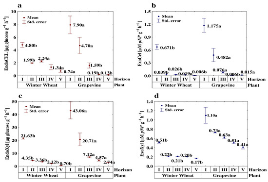 Effect of the cultivated plant and soil depth on the endo-cellulase (endoCel) (a), exo-cellulase (exoCel) (b), endo-xylanase (endoXyl) (c) and exo-xylanase (exoXyl) (d) activity. Different small letters indicate significant differences (p < 0.05) between cultivated plants (in the same soil depth/layer).