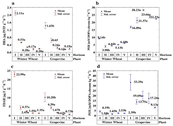 Effect of the cultivated plant and soil depth on dehydrogenases (DHA) (a), peroxidase (PER) (b), of hydrolysis of fluorescein diacetate sodium salt (FDAH) (c) and phenol oxidase (POX) (d) activity. Different small letters indicate significant differences (p < 0.05) between cultivated plants (in the same soil depth/layer).