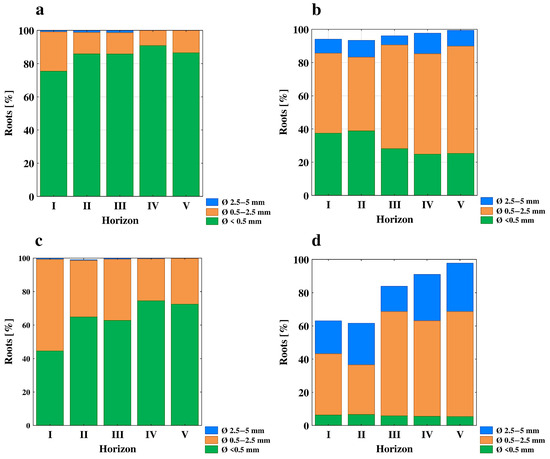 Contribution of different root diameters (mm) in the total length of the root system; winter wheat profiles (a,c) and grapevine profiles (b,d).