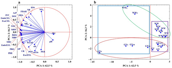 Most of the studied properties were negatively correlated with PC1, because all of them had high negative loading scores concerning this component which ranged from −0.638 to −0.980 (Figure 4a). This proves that PCA1 explains the very high percentage of variance (e.g., 96% endoXyl). In turn, PCA2 clearly separated the studied variables into three groups. One group of variables explained the high positive correlation (DHA, FDAH, NR), while some of them (POX, aGlu, PER) were more closely but negatively correlated with this component. However, most of the determined variables did not show any significant correlation with PCA2. A PCA analysis showed that PCA1 separated layers (surface and sub-surface) with higher and lower organic matter content. Cases with a higher OM content showed a negative correlation with PCA1, while cases with a lower OM content demonstrated a positive correlation with this component. It was also noted that the increase in correlation coefficients was related to the increase in organic carbon content (Figure 4b). However, PCA2 divided the samples into 2 groups: the samples collected from winter wheat profiles (positive relationship) and the samples taken from profiles located in vineyards (the negative relationship).