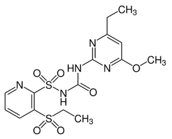 Chemical name: sulfosulfuron. IUPAC name: 1-(4,6-dimethoxypyrimidin-2-yl)-3-(2-ethylsulfonylimidazo[1,2-a]pyridin-3-yl)sulfonylurea (Figure 1) [36]. Molecular formula: not provided. Sulfosulfuron belongs to the sulfonourea group, characterized by the chemical structure represented in Figure 1. Its molecular formula, registry number, molecular weight, and GHS classification can be found in publications [36,37].
