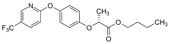 Synonyms: Fluazifop-P-Butyl, Fusillade Super, Fusillade 2000, Fusillade S, Fusillade DX, Fusillade II, and Fluazyfop-P-butyl [ISO]. Chemical formula: C19H20F3NO4. CAS number: 79241-46-6. Fluazifop-P-Butyl, also known by various trade names, is represented by the chemical formula C19H20F3NO4. It is a selective herbicide that inhibits weed growth. The compound’s systematic name is (2R)-2-[4-[5-(trifluoromethyl)pyridin-2-yloxy]phenoxy]propanoic acid butyl ester (Figure 4) [36,37].