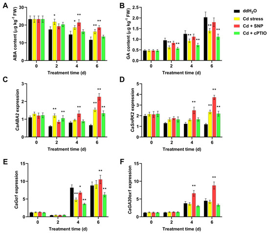 3.3. The Role of NO on the Accumulation of ABA and GA in C. auriculatum Seeds under Cd Stress