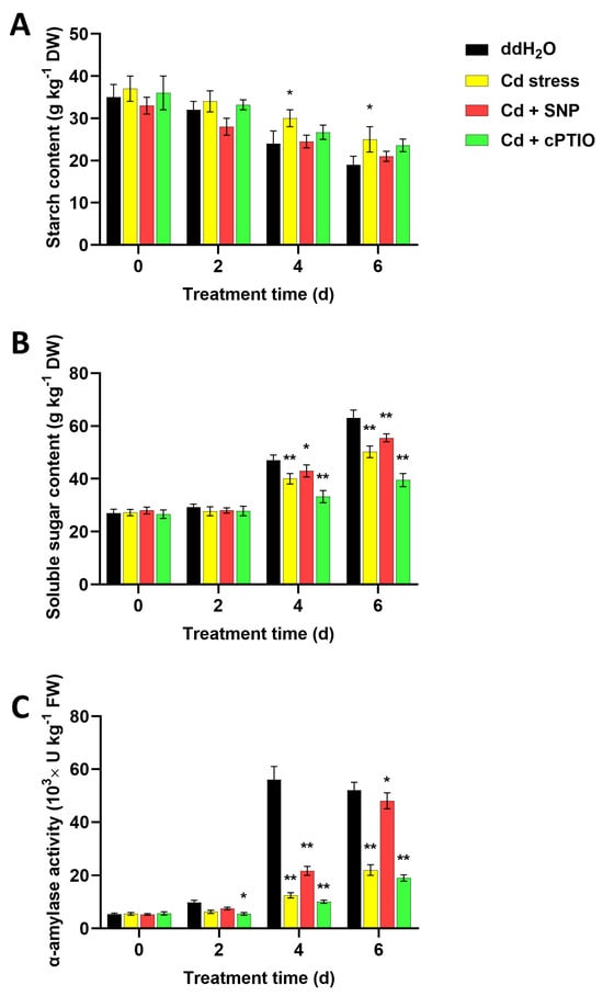 3.4. The Role of NO in Starch Degradation of C. auriculatum Seeds under Cd Stress