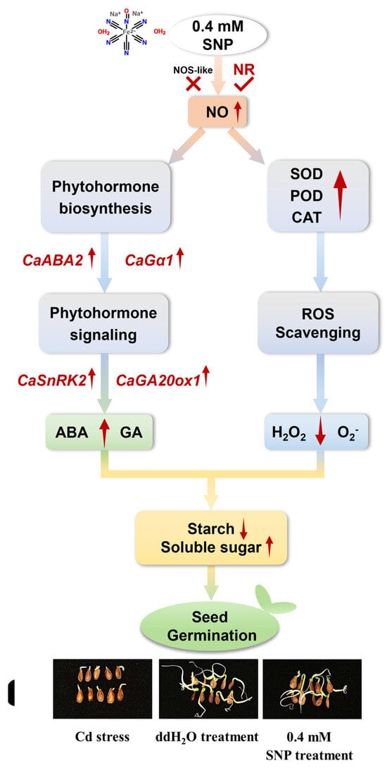 - Zhang, Y.; Wang, R.; Wang, X.; Zhao, C.; Shen, H.; Yang, L. Nitric Oxide Regulates Seed Germination by Integrating Multiple Signalling Pathways. Int. J. Mol. Sci. 2023, 24, 9052. [Google Scholar] [CrossRef]