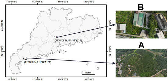 Experiment, (A) Aerial photo of collection location A, (B) Aerial photo of collection location B area.
