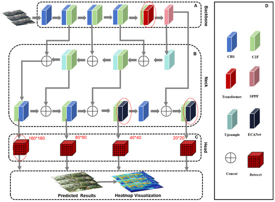 Overall framework of litchi recognition. (A) The backbone of the model, (B) the neck of the model, (C) the head of the model, and (D) the name corresponding to each module. Red oval dotted boxes indicate areas for improvement.