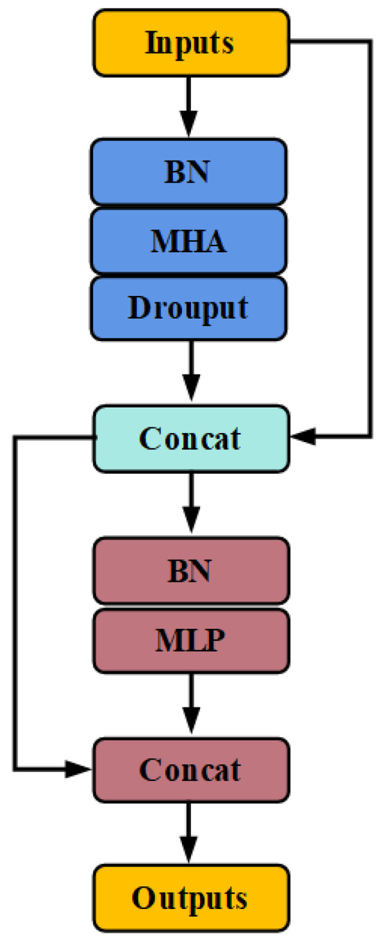 As shown in Figure 4, first, the litchi image feature information is input into the BN layer to standardize the distribution of feature information to improve the training speed, and it is then connected to a MHA module. This module is designed to enhance the algorithm’s extraction of deep feature information from images and improve the model’s accuracy when detecting images with multiple scales, small targets, and high noise levels. In order to suppress network overfitting, a dropout layer is added after the MHA module. At the same time, the input and feature information extracted through the MHA module is weighted and combined to make the feature information clearer. A batch normalization layer and a MLP are then connected to improve the neural network’s nonlinear fitting and expression abilities and thus further improve its performance. Finally, all feature information is weighted and output to ensure the integrity of the feature information, thereby improving the detection accuracy of the neural network [24].