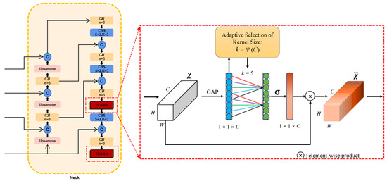 In response to the above problems, in this study, the ECANet module is introduced into the YOLOv8 model by adding it to the neck of the module in the algorithm model, enhancing the model’s feature extraction capability and thus improving its recognition accuracy. As is shown in Figure 5, the ECA module is used in front of 40 × 40 and 20 × 20 detection heads. In particular, in the experiment, the attention mechanism was not used before all detection heads due to the accuracy was not improved.