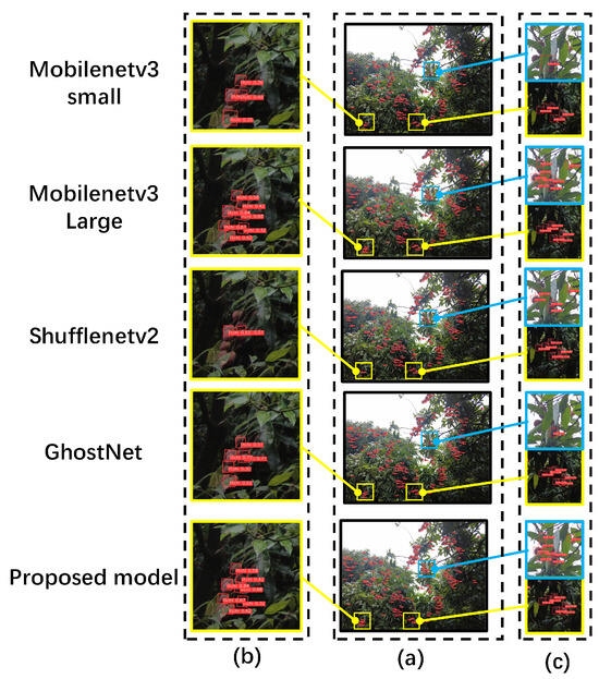Litchi detection in naturally dense scenes has always been a challenge. Insufficient feature information, small litchi sizes, and occlusion can easily lead to missed and false detections. Four different advanced backbone network models were chosen for comparison in this paper, namely, MobilenetV3-Small, MobilenetV3-Large [39], ShuffleNetV2 [22], and GhostNet [47]; the comparison results are shown in Table 3.