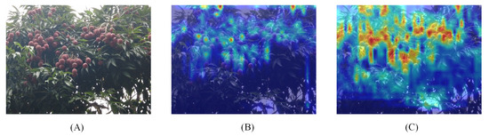 Comparison of visualization feature maps. (A) Original litchi image. (B) Feature map of the YOLOv8n model. (C) Feature map of the proposed model.