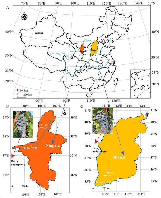The same international grapevine cultivar, Vitis vinifera L. cv. ‘Cabernet Sauvignon’, which is grown in two commercial vineyards—‘Yaojing’ winery in Xiangfen (Shanxi) and ‘Hejinzun’ winery in Yongning (Ningxia), China—was employed in this study [16] (Figure 1). These vineyards have distinct climatic conditions. Grape samples were collected between June and October 2022. The vines from both regions were self-rooted, oriented in a north-south direction, and spaced at 3.0 m × 1.0 m, and only vines with uniform growth vigor were sampled. All vines from both regions were trained in a vertical shoot-positioning trellis system with a sloped trunk. The vineyards from both regions were drip-irrigated using the same vinicultural methods. Meteorological data of the two vineyard sites in 2022 were obtained from the China Meteorological Data Service Center (https://data.cma.cn/en, accessed on 5 December 2022) (Supplementary Table S1).