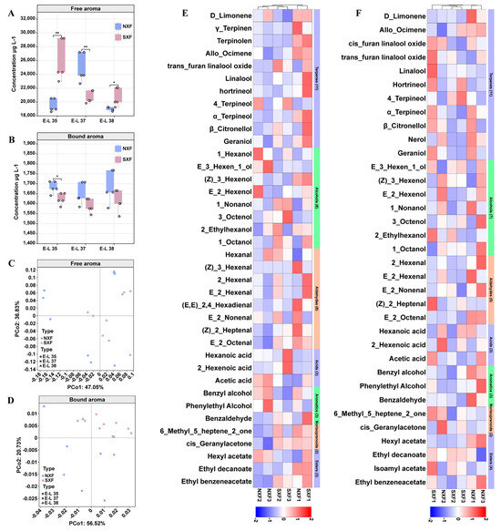 Dynamic changes of volatile aroma compounds concentrations during grape ripening at two different regions. Total concentration of free aroma (A) and bound aroma (B). Principal coordinate analysis (PCoA) based on Bray–Curtis and weighted UniFrac showing the geographical distance of free aroma (C) and bound aroma (D) at two regions, respectively. Heat map of free aroma (E) and bound aroma (F). NXF, grapes from the Ningxia region; SXF, grapes from the Shanxi region. Grape samples collected at the E-L 35 stage (NXF1 and SXF1), at the E-L 37 stage (NXF2 and SXF2), and at the E-L 38 stage (NXF3 and SXF3).