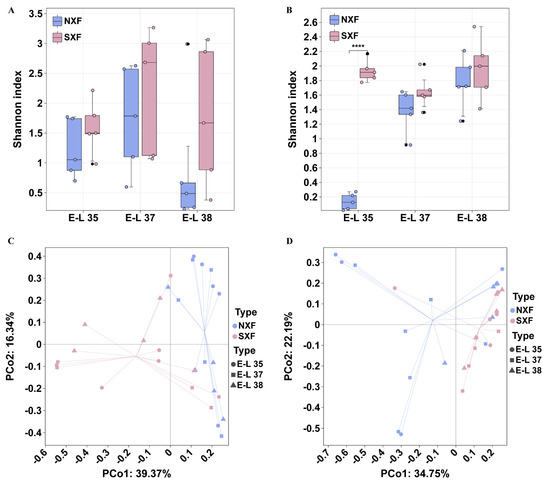 The microbial community diversity of grape berries during ripening at two different regions. The Shannon indexes of bacteria (A) and fungi (B) showing alpha diversity of microbial communities, with results expressed as median ± SD of five biological replicates; ****, p < 0.0001. Principal coordinate analysis (PCoA) based on Bray–Curtis and weighted UniFrac showing the beta diversity of bacterial (C) and fungal (D) communities, respectively. NXF, grapes from the Ningxia region; SXF, grapes from the Shanxi region. Grape samples collected at the E-L 35 stage, at the E-L 37 stage, and at the E-L 38 stage, respectively.