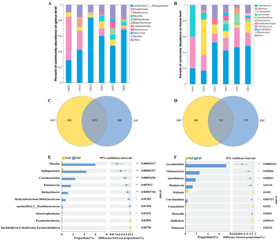 The microbial community structure of grapes during ripening. Barplots showing the bacteria (A) and fungi (B) community composition characterized to the genus level (showing top 10). Venn diagrams showing the shared and unique OTUs of bacteria (C) and fungi (D). The significant differences of bacterial (E) and fungal (F) genera relative abundances between two different regions. ***, p < 0.001; **, p < 0.01; *, p < 0.05. NXF (NXF1, NXF2, NXF3), grapes from the Ningxia region; SXF (SXF1, SXF2, and SXF3), grapes from the Shanxi region. Grape samples collected at the E-L 35 stage (NXF1 and SXF1), at the E-L 37 stage (NXF2 and SXF2), and at the E-L 38 stage (NXF3 and SXF3).