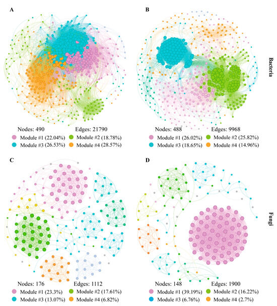 Microbial interactions significantly affect the structures of microbial communities. Recently, co-occurrence patterns among microbial community components have been visualized using microbial networks [35]. In this study, we constructed four co-occurrence networks (Figure 5A–D) to assess the interaction patterns of microorganisms in grape berries from the two distinct regions. The endophytic bacterial network in NXF comprised 490 nodes with 21,669 positive and 121 negative edges, whereas that in SXF comprised 488 nodes with 9930 positive and 38 negative edges (Figure 5A,B; Supplementary Table S2). The endophytic fungal network of grape berries exhibited smaller network sizes than those of the endophytic bacterial network, with 176 nodes (1102 positive and 10 negative edges) in NXF and 148 nodes (1899 positive and one negative edge) in SXF (Figure 5C,D; Supplementary Table S2). Bacterial and fungal interactions consistently show co-occurrence patterns rather than co-exclusion modes, with over 99% of the relationships being positive, irrespective of the influence of vineyard sites [36]. Using the module-selection strategy, we identified four primary modules from microbial networks both in NXF and SXF. These modules represented 95.92% and 85.45% of the total number of modules in the NXF and SXF bacterial networks, respectively, and 60.8% and 64.87% of the total number of modules in the NXF and SXF fungal networks, respectively.