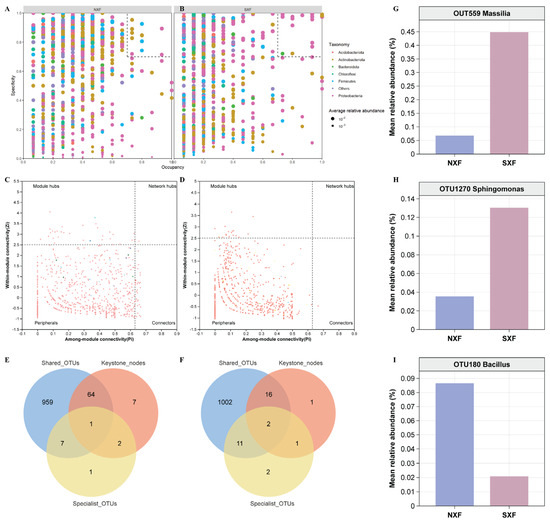 Identification of core species. The SPEC-OCCU plots of the bacterial network show 1594 most abundant OTUs in each habitat type; the x-axis represents occupancy: how well an OTU is distributed in NXF or SXF; and the y-axis represents specificity: whether they are also found in other regions. Here, to find specialist species attributable to NXF (A) or SXF (B), we selected OTUs with specificity and occupancy greater than or equal to 0.7. The Zi-Pi method to reveal core hubs of bacterial networks in NXF (C) and SXF (D). Screening for core species based on “Shared OTUs”, “Specialist OTUs”, and “Keystone nodes” in NXF (E) and SXF (F). The relative abundance of core species identified in the NXF (I) and SXF (G,H) bacterial network. Specificity is defined as the ratio of the average abundance of a species in a habitat and the sum of the average abundance of each habitat of this species across all habitats; that is, a higher specificity indicates that the species is specific to a habitat type relative to other habitats. Occupancy is defined as the ratio of the number of samples in which the species is present to the total number of samples in a habitat; that is, a higher occupancy indicates that the species is common in the habitat [24]. NXF, grapes from the Ningxia region; SXF, grapes from the Shanxi region.
