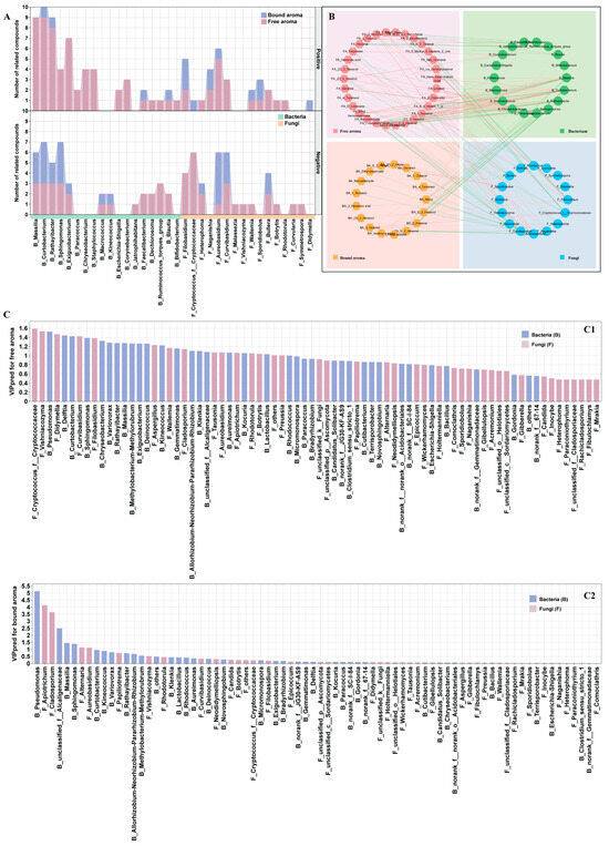 Correlation analysis between abundant bacterial and fungal taxa and volatiles (free aroma and bound aroma) during grape ripening at two different regions. Summary of significantly positive- and negative- related volatiles (A). Correlation networks based on Spearman pairwise coefficients (|r| > 0.6 and p < 0.05) (B), with red and green lines representing positive and negative correlations, respectively. VIP (pred) (variable importance in projection) values of bacterial and fungal taxa (relative abundance > 0.1%) correlated with free aroma (C1) and bound aroma (C2) based on O2PLS analysis (microbial taxa, X; volatile compounds, Y). FA, free aroma; BA, bound aroma; F, fungi; B, bacteria. For interpretation of the references to color in this figure legend, the reader is referred to the web version of this article.