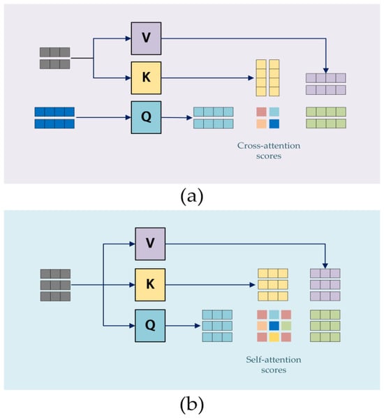 In the cross-attention mechanism, two input sequences of the same dimension are asymmetrically combined [], with one sequence serving as query , and the other as key and value inputs. The simplified computational flowchart is shown in Figure 1a. Cross-attention is computed as follows: