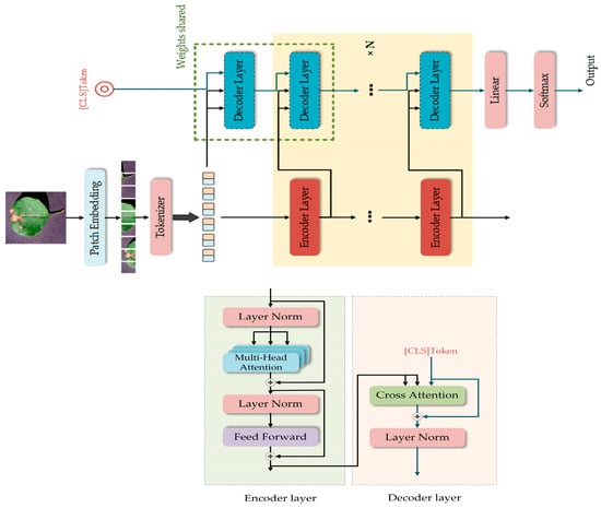 Our model is illustrated in Figure 2. The upper part of Figure 2 represents the entire architecture. Plant disease images are processed into smaller image patches through the patch embedding block, and then the Tokenizer block encodes these image patches, converting them into token sequences. The token sequences and the [CLS] token serve as two separate inputs to the backbone network. The backbone consists of N identical layers. Each layer accepts two inputs and generates two outputs, which are then passed as inputs to the next layer. The [CLS] token output from the final layer is fed into the Linear and softmax blocks to produce output probabilities. The lower part of Figure 2 shows two aligned layers, namely the encoder layer and the decoder layer. The encoder layer is exactly the same as in the ViT model, consisting of two sub-layers. The first sub-layer is the multi-head self-attention mechanism, and the second sub-layer is a simple fully connected feedforward network, with layer normalization applied before each sub-layer. Residual connections are applied around both sub-layers. The encoder layer takes the disease token sequence as input and processes it through the two sub-layers, with the multi-head self-attention mechanism capturing relationships between the token sequences. The decoder layer uses a cross-attention mechanism, taking the output of its aligned encoder layer along with the output from the previous decoder layer as input. The cross-attention mechanism, through the [CLS] token, learns the features of the disease token sequence and is used to acquire the disease category features.