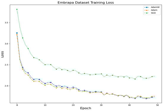 Training loss under different optimization algorithms for the EMBRAPA dataset.